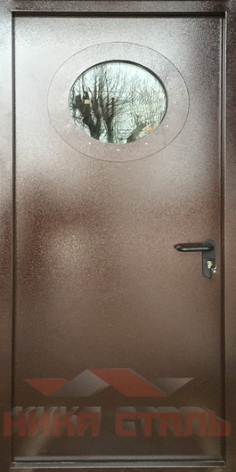 Коричневая противопожарная дверь из оцинкованной стали с круглым стеклом Арт-160